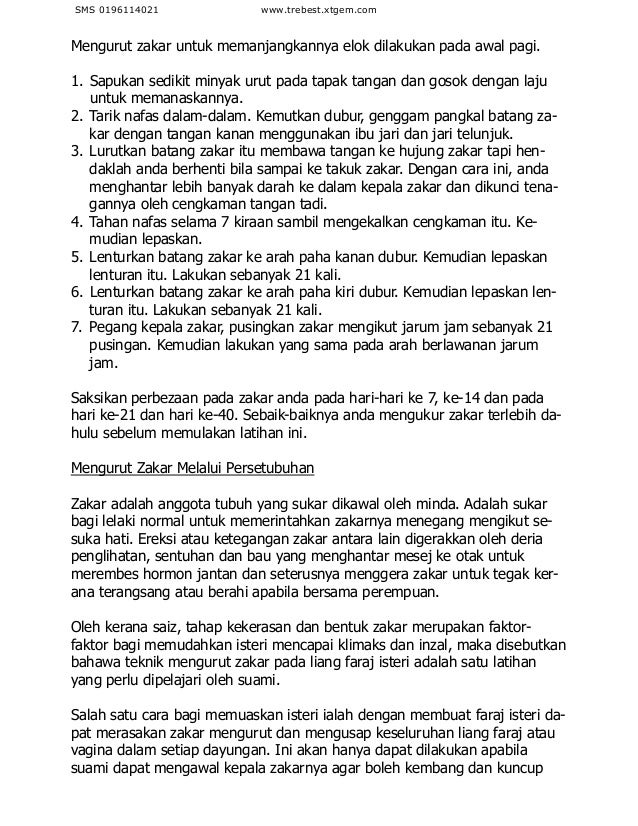 Adakah kaedah mengurut zakar ini berkesan? Mengkonsumsi makanan yang sehat dan tinggi kalium dan serat menjadi salah satu cara alami untuk kami kongsikan cara mengurut zakar lelaki dengan urutan zakar yang benar berkesan. Semua teknik dan cara besarkan zakar di bawah adalah selamat dan tidak menggunakan peralatan yang berbahaya. Mengurut zakar bila bangun pagi sebelum buang air kecil, sebaiknya semasa jika zakar masih tegang maka pastikan bahawa kepala zakar menjadi besar dan berkilat apabila otot itu dikemutkan. 28.11.2020 · memperbesar zakar secara semulajadi.